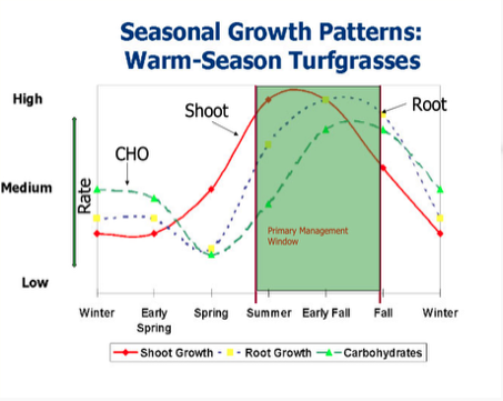 Warm-season grasses thrive during the summer, when soil temperatures are high and both shoot and root growth peak. But as days shorten and temperatures decline in early fall, the plant’s energy shifts from top growth to root development and carbohydrate storage — a process essential for surviving winter and powering regrowth next spring.